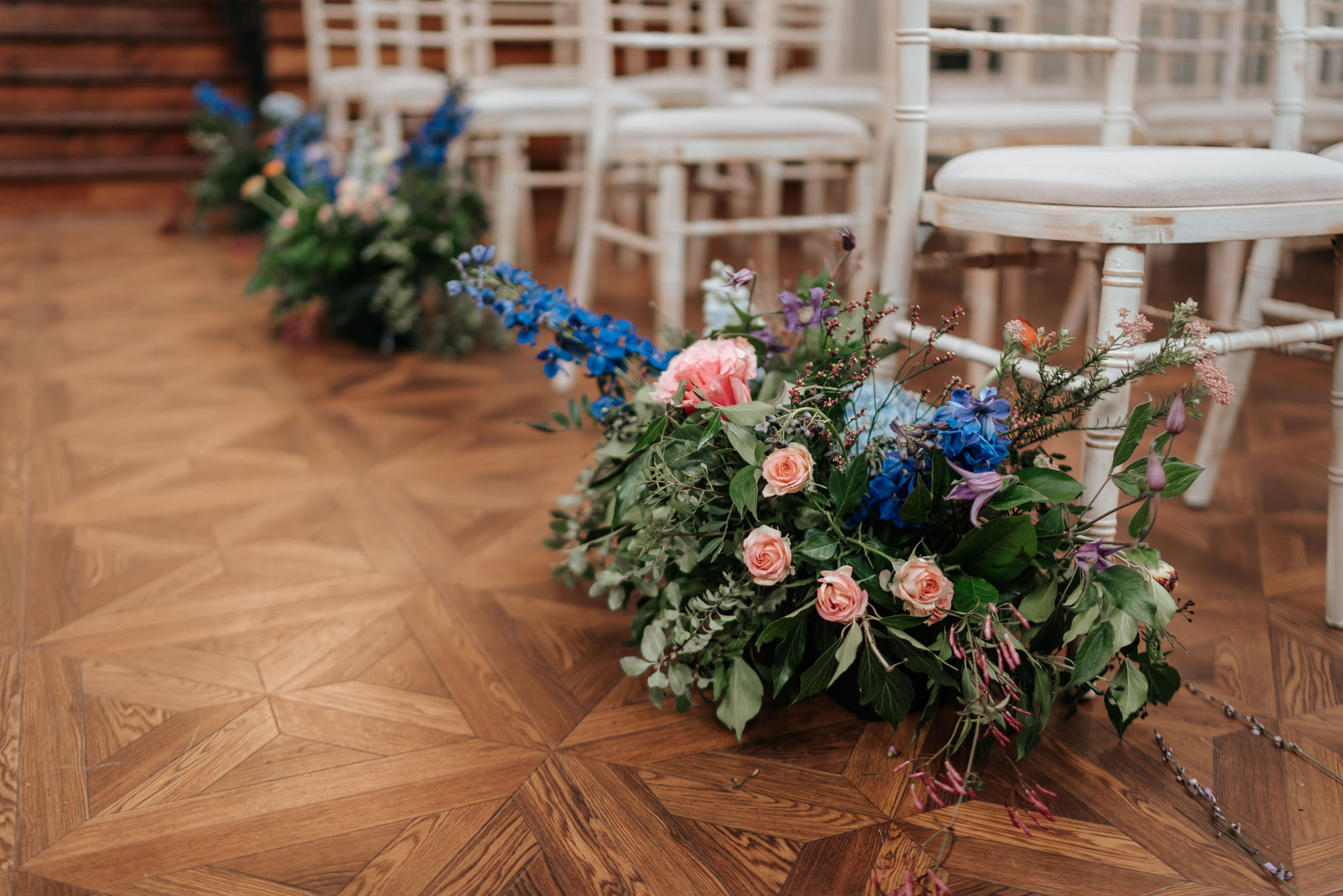 Statement wedding aisles – Aisles lined with floating pillar candles or lanterns add a touch of elevated romance to indoors or outdoors spaces, while lush, dark greenery and jewel-toned florals give off moody vibes perfect for industrial venues or botanical garden weddings.