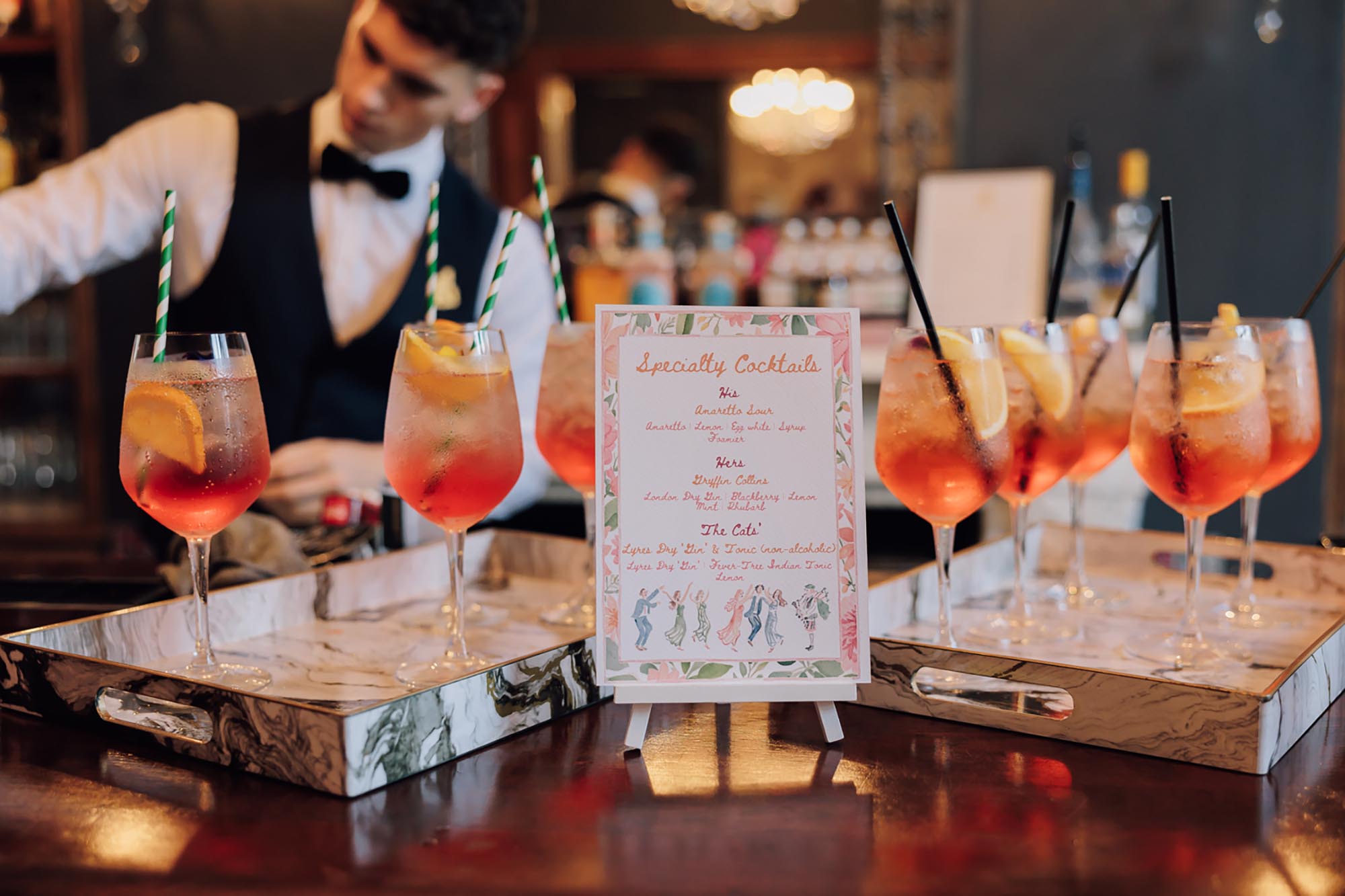 The Gryffin Bar is a firm favourite space for many of our couples and guests. From the night prior atmosphere which feels like a country pub, to the lively day of celebrations, ensuring that guests can swiftly get a beverage and head back to the dancefloor. The bar provides a wide range of drinks, where we hope that everyone can find their ‘favourite tipple’, or a well chosen alternative.